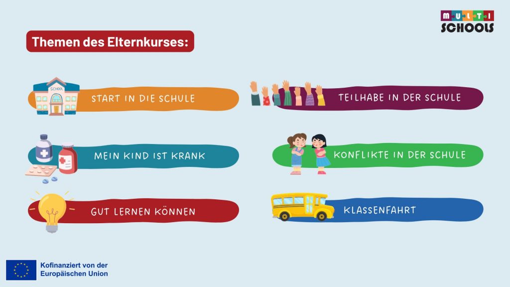 Wie können Eltern mit Migrationsgeschichte ihre Kinder im Schulalltag besser unterstützen – auch wenn ihnen das Schulsystem noch fremd ist? Mit dieser Frage hat sich unser Erasmus+-Projekt Multischools beschäftigt und praktische Lösungen für die gesamte Schulgemeinschaft entwickelt: für Lehrkräfte, Erzieher:innen, Kinder und Eltern.